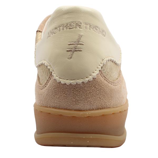 Elevate your outfit with these stunning Another Trend trainers for women. These neutral trainers are crafted from soft beige suede and metallic gold reptile print panels, it delivers both comfort and sophistication. The leopard print Another Trend branding on the side makes a bold statement. A classic lace closure ensures a secure fit, while the rubber sole provides durability and all-day wearability.