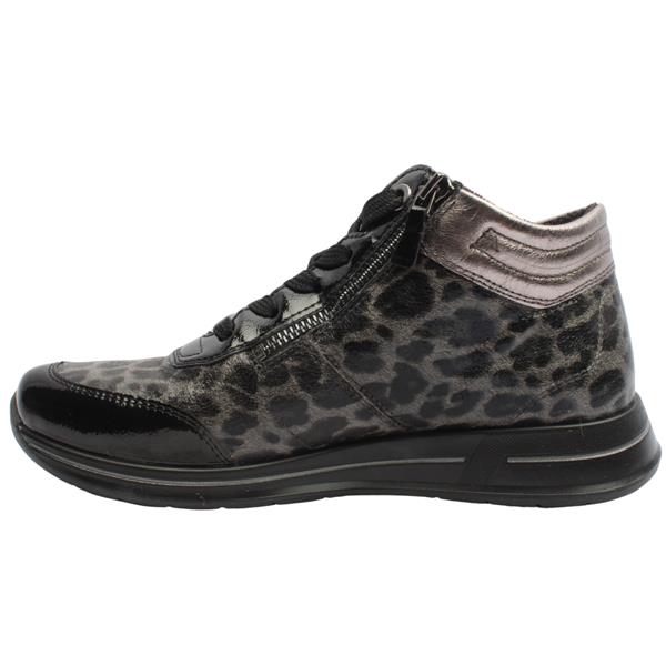 Stylish and comfortable ladies boots from Ara shoes with a striking animal print design.. These hi-top ladies boots are a H wide fitting allowing for a more comfortable roomy fit. Deisgned with a removeable cushioned High Sole insole which offers all day comfort and allows for extra room if needed. The lace, a double zip closure combined with the fold down tongue allow for easy on/off.