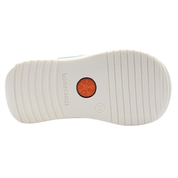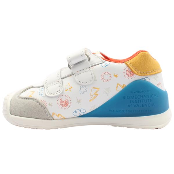 Boys shoes from Garvalin by Biomecanics. These boys shoes have a soft white upper with a cute design. This style features a velcro closure and fold down tongue for easy on and off.  Removable antibacterial insoles with a handy fit guide ensure the perfect fit.The reinforced heel and toe protect busy little feet!