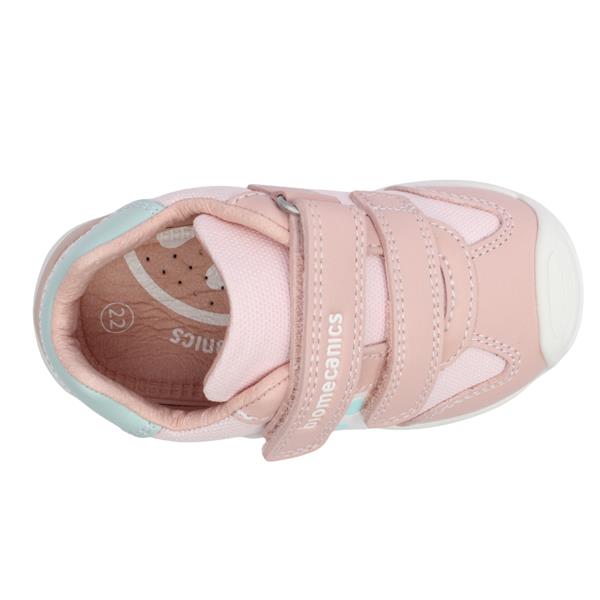 Designed to support growing feet, the Biomecanics Girls Shoe 262121 combines comfort, style, and expert-approved foot health. Crafted in soft pink fabric with rose pink leather accents and a fresh mint detail at the back of the heel, this shoe is as stylish as it is practical. It features a removable Always Dry insole with a built-in fitting guide to help ensure the perfect fit as little feet grow. The shoe is engineered to be odour and bacteria free, keeping feet fresh and comfortable throughout the day. Recommended by pediatricians, chiropodists, and early childhood educators, this shoe supports healthy foot development. Double Velcro straps and a fold-down tongue make it easy to put on and take off, encouraging independence while ensuring a secure fit.