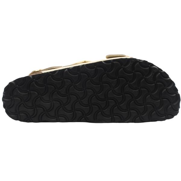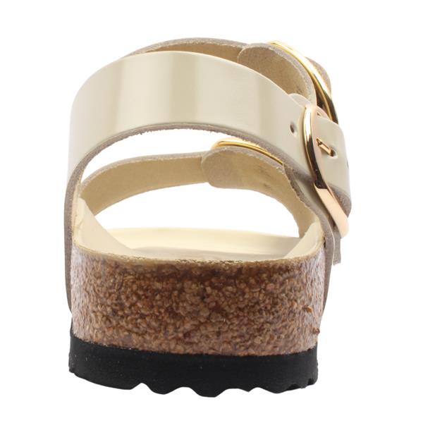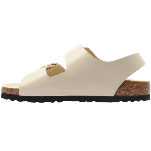 Ladies Birkenstock sandals with a heel strap for a secure fit. The Birkenstock Milano Big Buckle features a large, elegant pin buckle design. These ladies sandals feature a high shine ecru upper. The signature contoured footbed provides unparalleled comfort and support, making them perfect for all-day wear. The lining of this footbed is covered with soft smooth leather and matches the shoe in color.