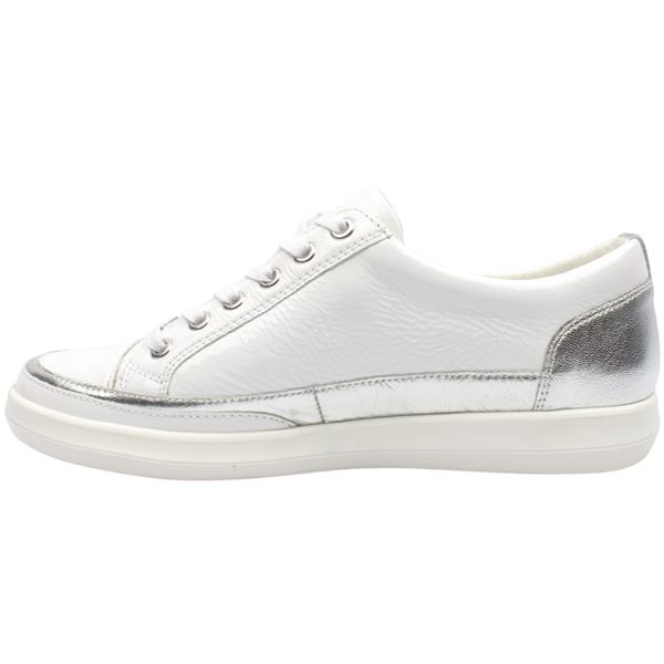 Step into effortless comfort with the womens trainers from Caprice shoes. The sleek white patent upper design adds a polished high shine finish. Designed for both style and practicality the lace up front allows for a secure and adjustable fit. The flat sole provides dependable comfort for all day wear. The leather insole offers breathable comfort and underfoot.