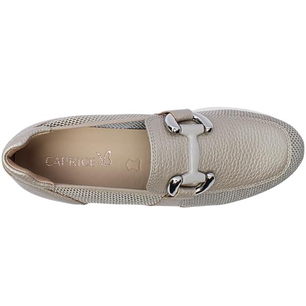 Step into effortless style and comfort with these ladies slip on shoes from Caprice shoes in a metallic grey upper. Designed with breathable mesh detailing, this shoe keeps your feet cool and comfortable all day. The soft leather insole provides a cushioned feel, while the elegant buckle detail on the front adds a touch of sophistication. Perfect for casual outings or dressing up a relaxed look, this slip-on combines convenience, comfort, and chic design in one.