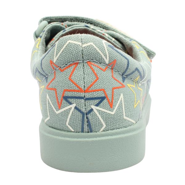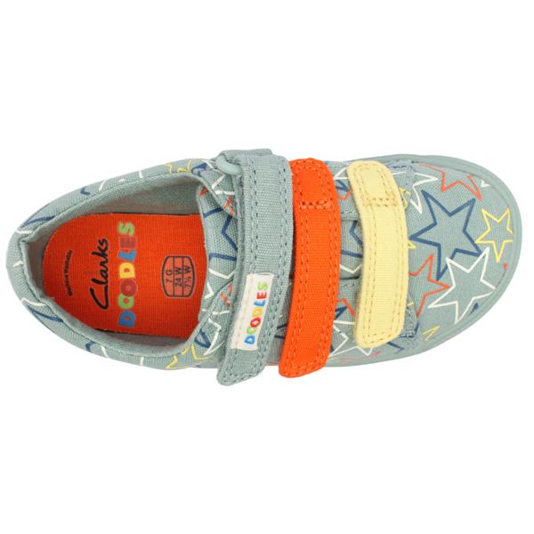 City Lane is a Clarks Doodles, boys shoe crafted in a versatile khaki green canvas upper with playful multi-star detailing, this casual shoe adds personality to any outfit while remaining easy to wear and durable. The multi-coloured triple Velcro straps allow for quick and simple fastening, making them perfect for independent wear and effortless on-and-off convenience. Designed for comfort and flexibility, the lightweight canvas construction supports natural movement, while the sturdy sole provides everyday durability. Ideal for pre school, play, and weekend outings.