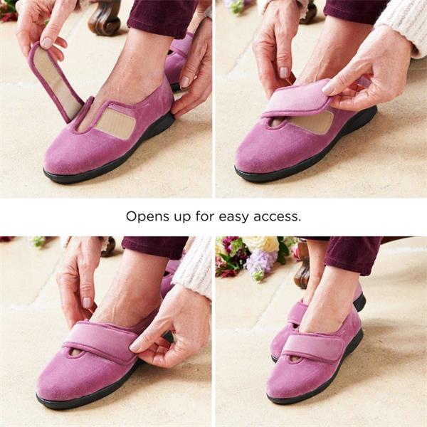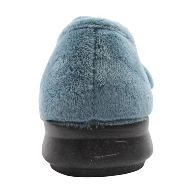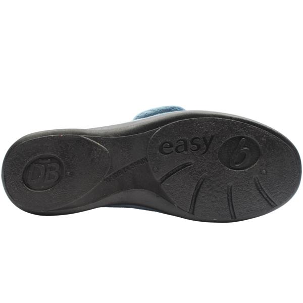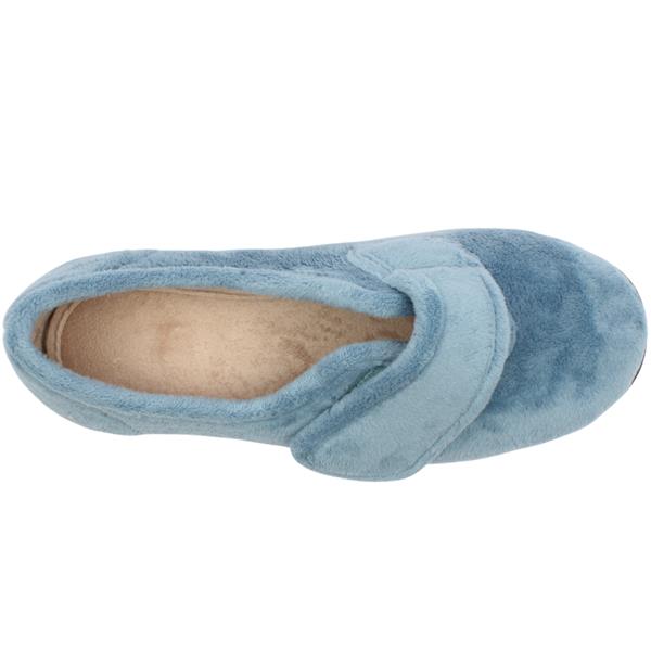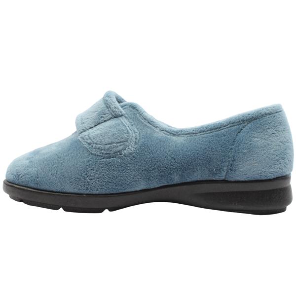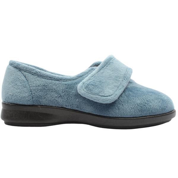 Step into comfort in these wide fitting slippers from DB Shoes - Style 72998 Fountain. Crafted from a soft velour upper in a blue colour way. Designed to open up wide and be easy to slip on and with adjustable Velcro strap. Featuring a shoe stiffener at the heel and flat sole this style offers more support than a traditional slipper. The 2V fitting makes them ideal for people from 2E-4E wide fits and they have a removable cushioned insole which can make them deeper if required. This style has no seams in the toe box making for an extremely comfortable wear. Machine washable to 30 Degrees.