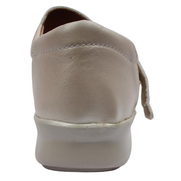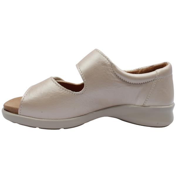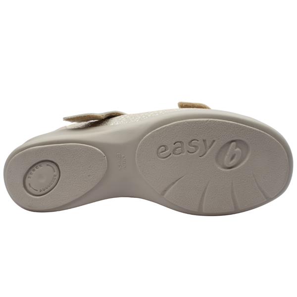 Step into everyday comfort with womens wide fitting sandals from Easy B shoes. Crafted with a soft beige leather upper this sandal is enhanced by a subtle gold shimmer panel on the side. Two adjustable Velcro straps provide a secure and personalised fit and make the sandal easy to slip on and off. Inside a cushioned removable insole secured with Velcro offers excellent comfort and can be taken out to accommodate custom orthotics.