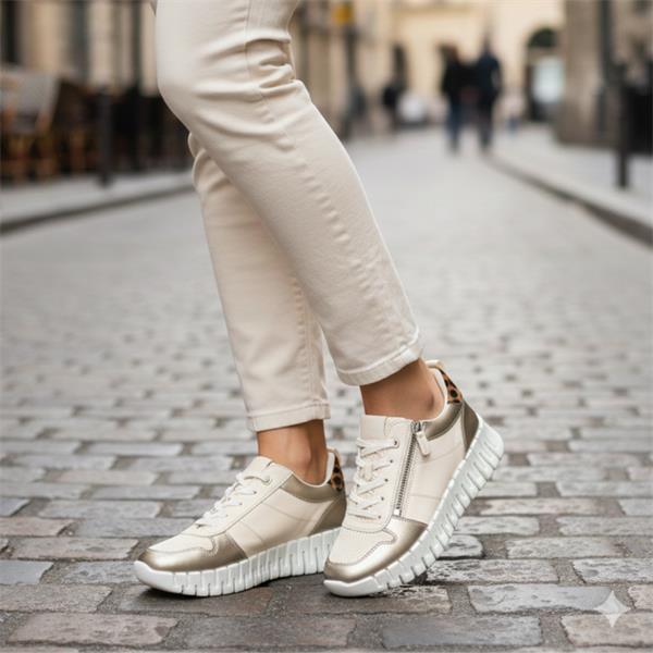 Step up your everyday shoe game with the ladies trainers from Ecco shoes. The striking beige and gold upper is elevated with a leopard print heel cap that adds bold and stylish contrast to a classic silhouette. Designed for easy wear and a personalised fit this trainer features both lace and zip closures. The Dual Fit system with a removable lower insole lets you tailor the width giving you extra room when you need it for all day comfort. Featuring the signature ECCO FLUIDFORM Technology for a natural fit and feel