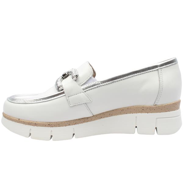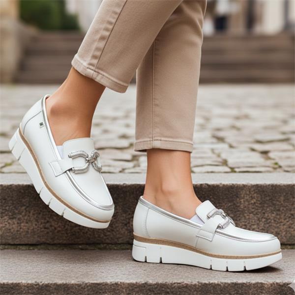 Elevate your everyday style with these ladies slip-on leather loafers from Dorking by Fluchos. Designed with contemporary silver detailing for a refined finish, they sit on a modern platform outsole enhanced by a cork rand, adding both height and standout style. Elastic gussets provide an improved, flexible fit, while the cushioned insole ensures lasting comfort. Finished with a lightweight, flexible outsole, these loafers are perfect for all-day wear with a fashion-forward edge.