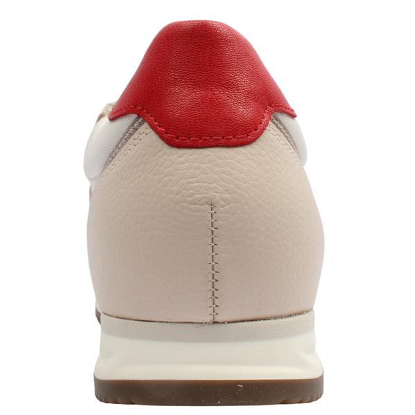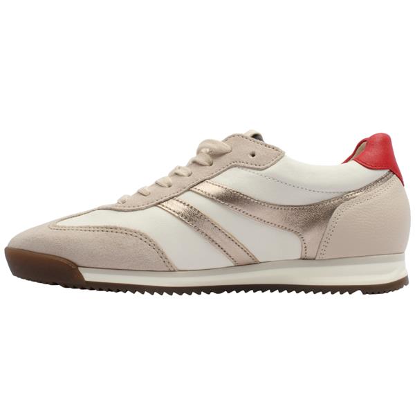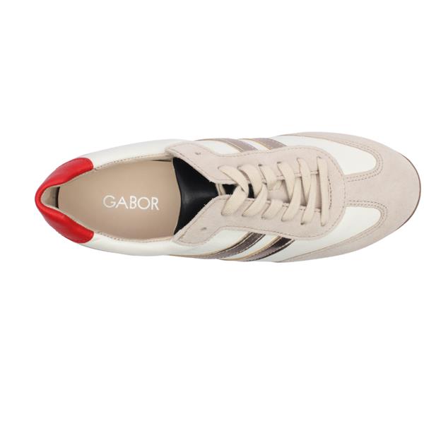 Step out in style and comfort with the Gabor Ladies Runners, 83430. Featuring a sophisticated beige design with a taupe nubuck toe, subtle gold detailing, and a pop of red at the back, this shoe effortlessly blends elegance with flair. A hidden heel provides height for those who like the trainer look but need a lift. The removable cushioned leather insole ensures all-day comfort, making it perfect for both casual and dressy occasions.