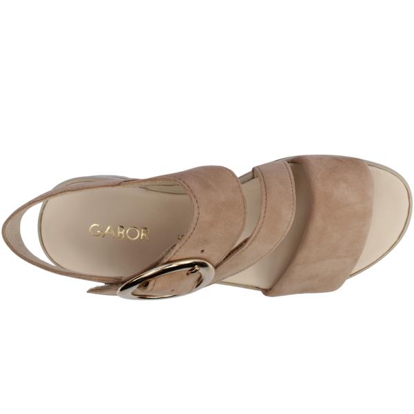 Step into effortless comfort with this chic womens sandal from Gabor shoes. Crafted from soft beige suede leather it features a subtle faux gold buckle detail. The double Velcro straps provide a secure and adjustable fit while the platform sole adds gentle height and contemporary flair. A soft leather insole ensures all day comfort making this sandal perfect for casual outings or dressier summer occasions.