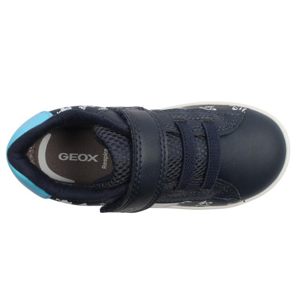 Designed for comfort and play, the perfect cute boys shoes from Geox shoes. The navy, blue and white upper is finished with a charming airplane motif across the side, making it a great choice for little explorers. A single Velcro strap with elasticated laces ensures a secure fit while allowing for quick and easy on and off. Lightweight and flexible, this trainer supports natural movement. Finished with the breathable Geox Respira insole it helps keep feet feeling fresh and comfortable.