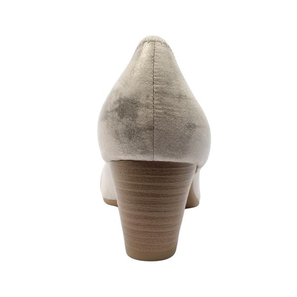 Ladies wide fitting court shoes from Jana Shoes. These low heel court shoes have a beige/gold toned faux suede upper and a wooden effect heel. This shoe is a H Wide fit so ideal for those who need extra room or added comfort. The round toe and cushioned soft line insole all add to the comfort of these shoes.