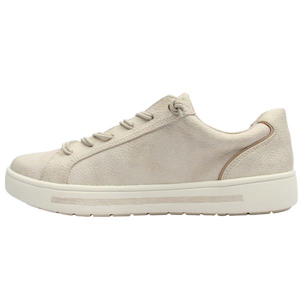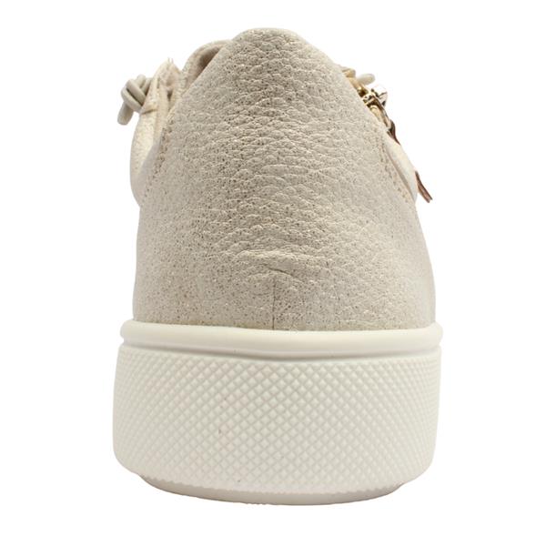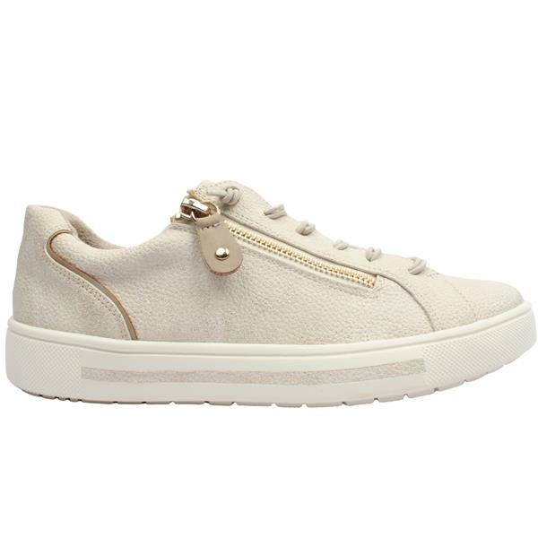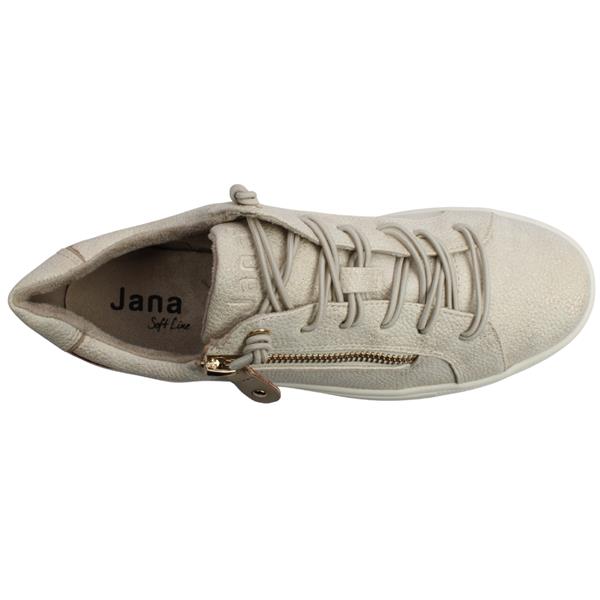 Ladies casual trainers from Jana shoes, designed in a chic light gold upper with a shimmered hue. Equipped with both elastic laces and a convenient side zip closure they ensure easy on/off. These trainers are crafted with an extra-wide H width fitting, ensuring optimal comfort. Perfect for everyday casual attire, they offer both style and practicality.