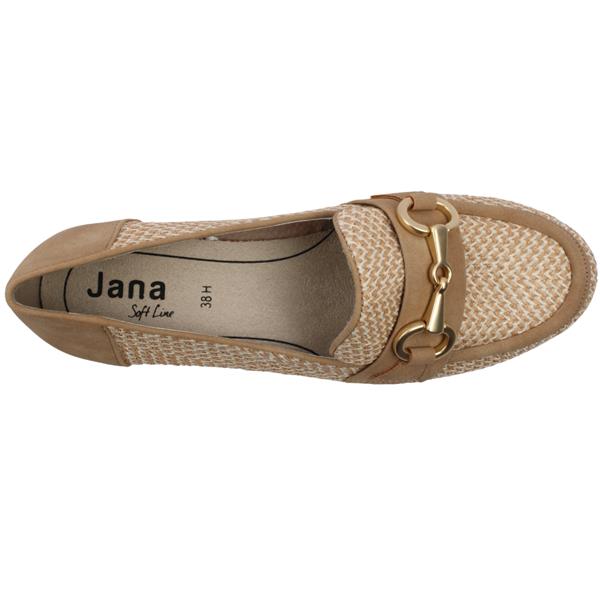 Stylish ladies loafers from Jana Shoes in a versatile beige woven upper. Designed in a H Wide Fit these shoes are ideal for those who prefer a roomier fit. The gold brooch across the front of the shoes adds extra charm to these shoes. The lightweight construction ensures all day comfort. The slip on design makes it easy to wear without compromising on fit or support.
