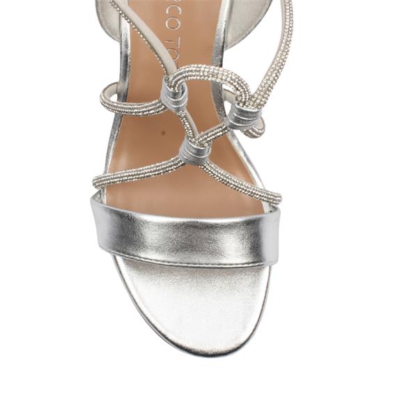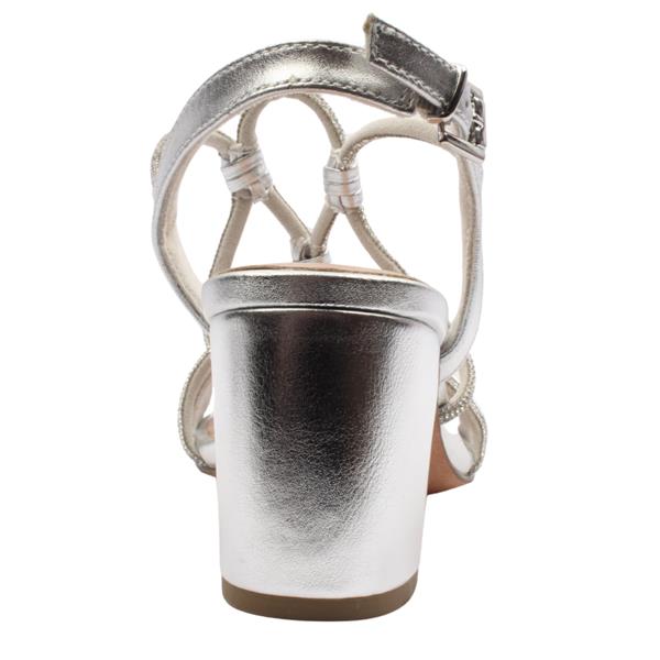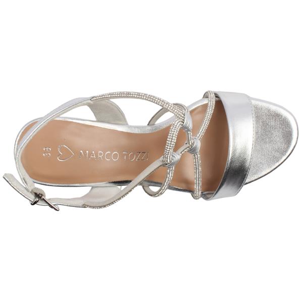 The Marco Tozzi 2-28388-46 silver strappy sandals are designed to add a touch of glamour to any outfit. These chic sandals feature a metallic silver finish paired with delicate, multi strap detailing that gracefully wraps across the foot. Diamante accents along the straps catch the light beautifully, making them perfect for special occasions. The adjustable ankle strap ensures a secure, comfortable fit, while the sturdy block heel provides stability without sacrificing style. A softly cushioned insole enhances all day wearability.