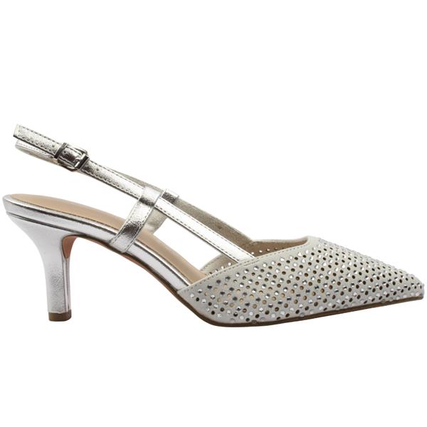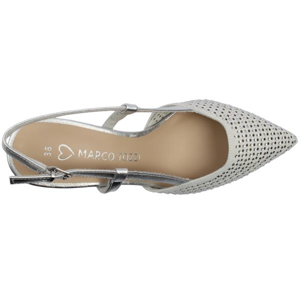 Womens sling back heels from Marco Tozzi shoes. The diamante adorned upper creates a sparkle that elevates every outfit. Subtle perforated detailing adds texture and visual interest while keeping the design breathable and chic. A sling back strap with adjustable buckle ensures a secure and personalised fit.