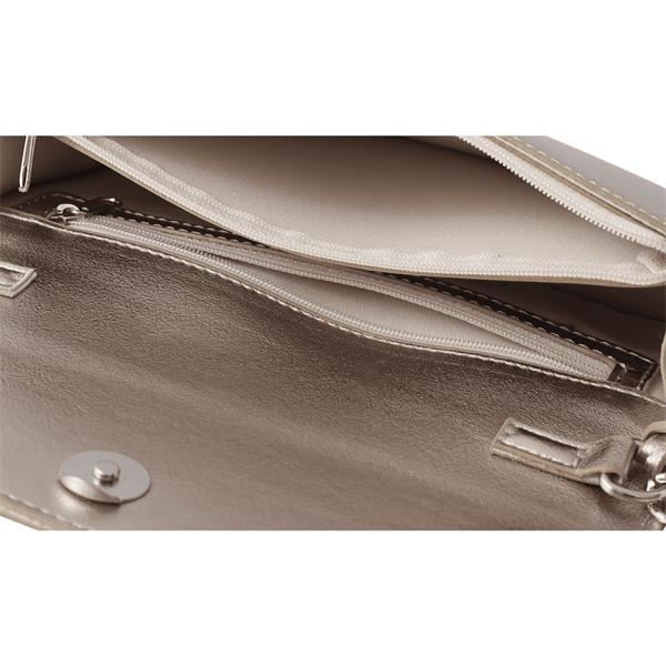 levate your evening or special-occasion look with this stylish Marco Tozzi clutch bag in a shimmering platinum finish. Compact yet thoughtfully designed, it’s the perfect accessory for nights out, weddings, parties, or any event where you want practicality with a touch of glamour. Approx. 21 cm wide × 12 cm deep,  large enough for essentials yet sleek enough to carry comfortably.