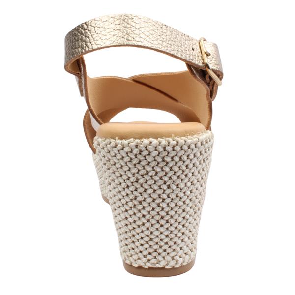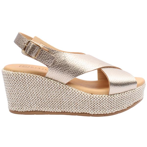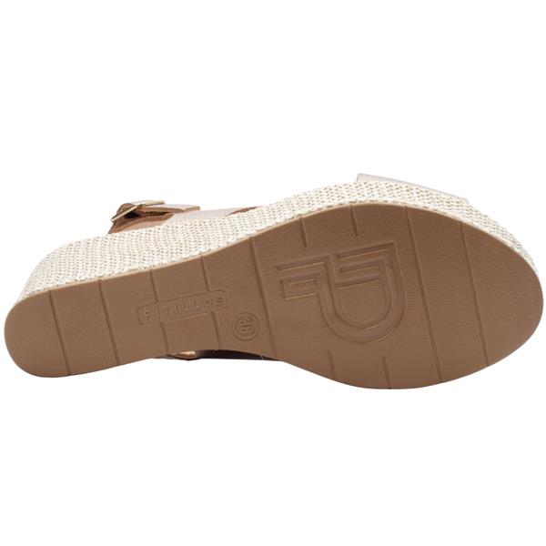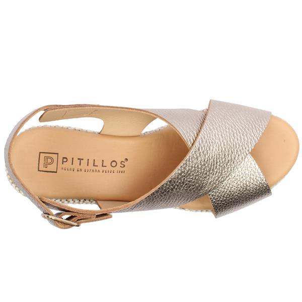 Refined and radiant, the Pitillos 11270 wedge sandal is designed to bring understated luxury to your warm-weather wardrobe. Finished in an elegant gold tone, this style exudes effortless sophistication while remaining easy to wear. The adjustable back strap with a polished buckle offers a secure, tailored fit with a touch of classic refinement. Set on a beautifully woven platform outsole, the sculpted wedge delivers graceful height and stability, creating a flattering silhouette without compromising comfort. Perfect for summer events, resort wear, or elevated everyday looks, this sandal blends craftsmanship, comfort, and timeless style.