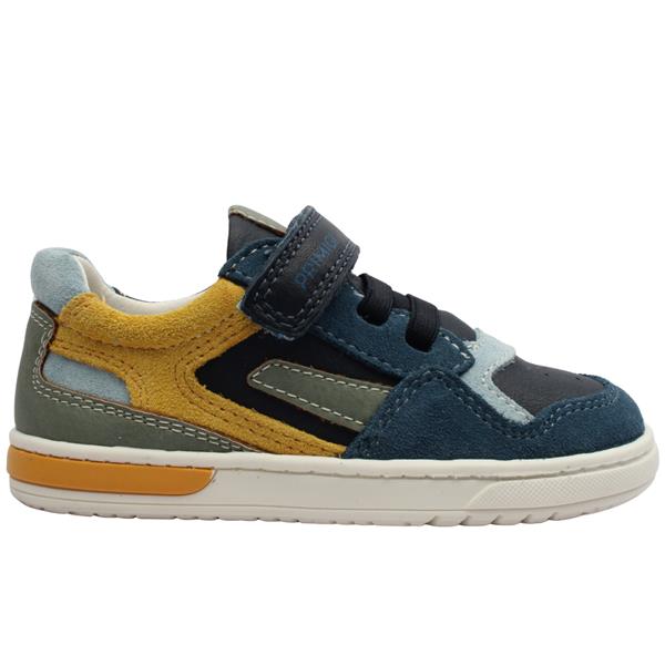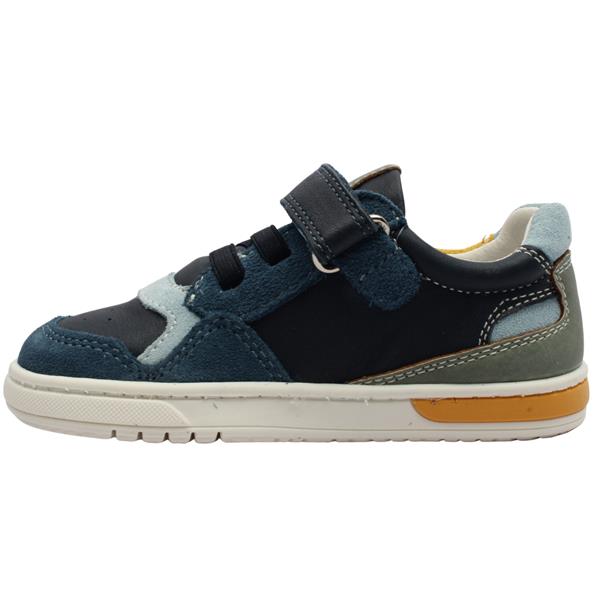 Stylish little boys shoes from Primigi shoes in a navy combination upper. Equipped with a Velcro strap and elastic lace closure , these shoes ensure a secure and adjustable fit, making them easy to put on and take off. The removable leather insoles, provide a customisable fit. The supportive Antishock cushioning in the heel is designed to protect the foot and absorb the micro-shocks normally experienced when walking.