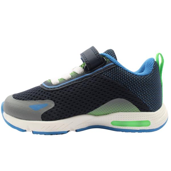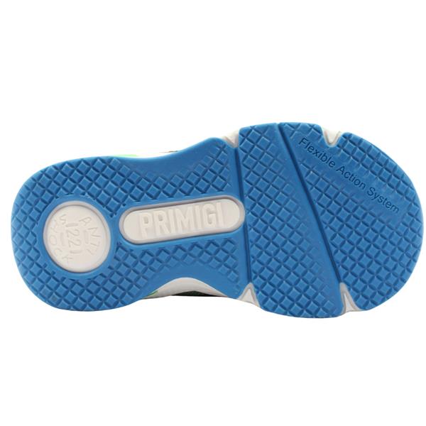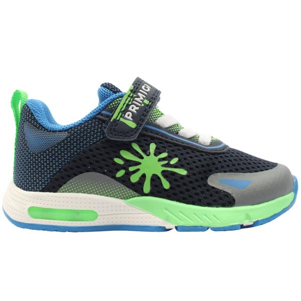 Boys light up shoes from Primigi Shoes. These boys shoes have a navy textile upper, with a reinforced toe for those active little feet. Deisgned with a Velcro strap and elastic lace closure for easy on/off while keeping the shoe secure on the foot. Flashing lights in the sole come on with each step. The cushioned leather insole ensures all day comfort and support and this can be removed to allow for a custom orthotic if needed.