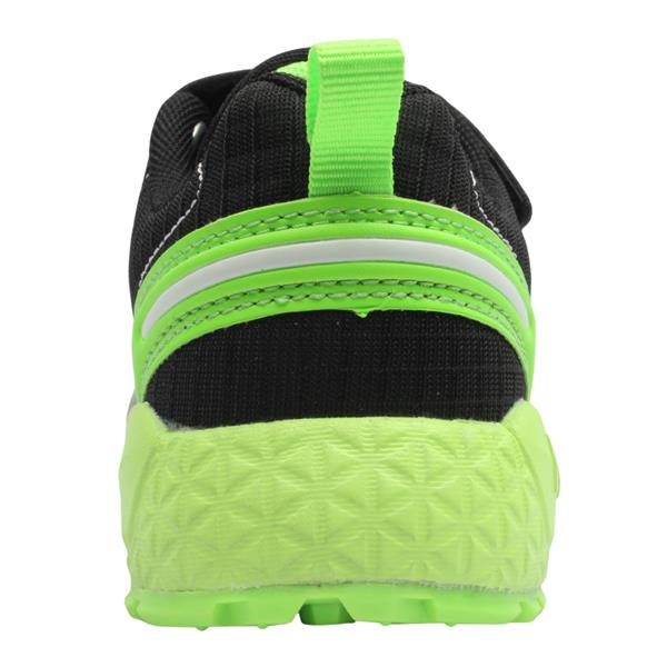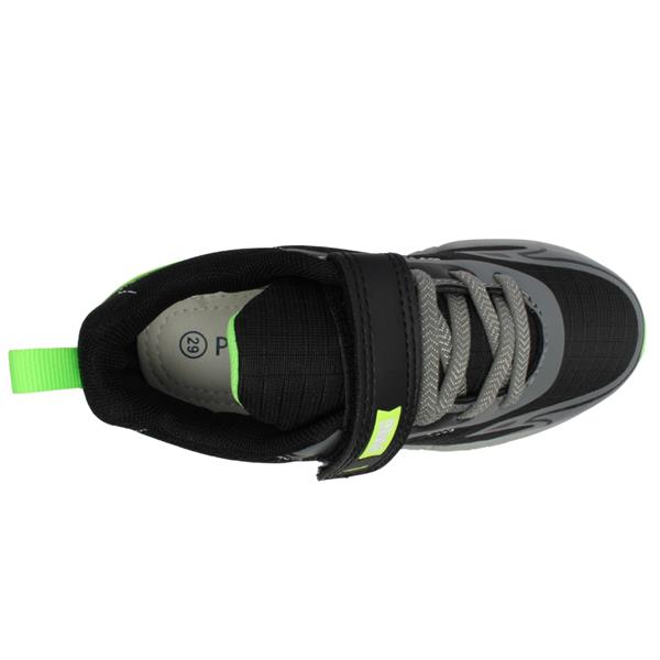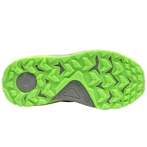 Boys runners from Primigi shoes in a black/grey upper with vibrant green detailing upper. Equipped with a Velcro strap and elastic lace closure , these shoes ensure a secure and adjustable fit, making them easy to put on and take off. The removable leather insoles, provide a customisable fit. The supportive Antishock cushioning in the heel is designed to protect the foot and absorb the micro-shocks normally experienced when walking. These trainers have a reinforced toe, ideal for active boys.