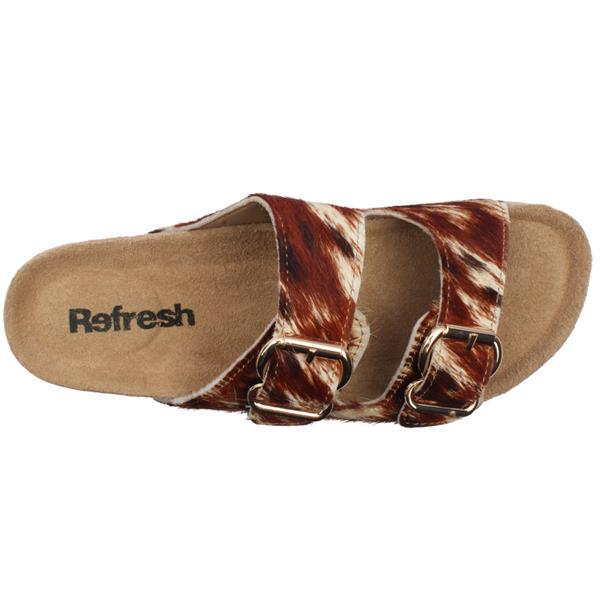 Brand: Refresh Style: 175013 Colour: Tan Multi Closure: Slip On Heel Height: Approx 5.cm Materials: Leather upper with faux hair design & leather/synthetic lining & manmade sole