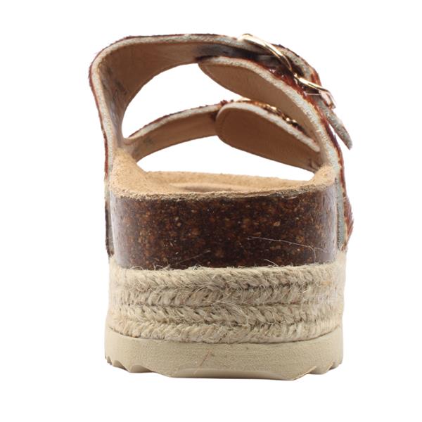 Ladies platform mules from Refresh Shoes. These ladies sandals have a classic two-strap design and sit upon a chunky platform sole. The standout feature of these sandals is the faux cow hair upper. A padded insole adds to the comfort of this style making them perfect for all-day wear.