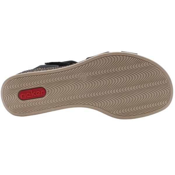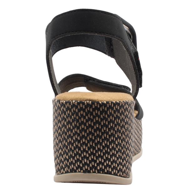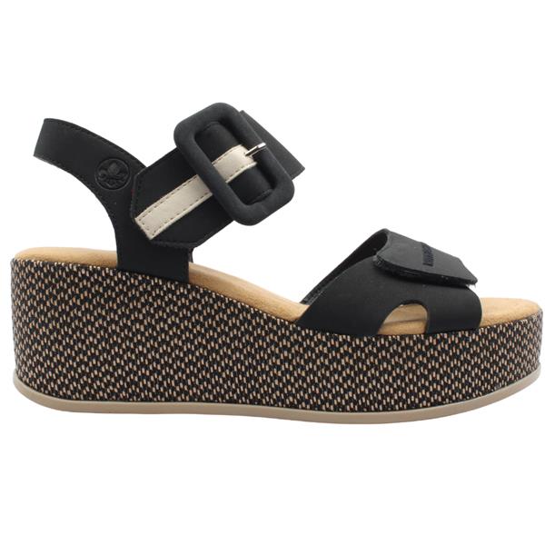 Step out in style and comfort with the Rieker 69450 Ladies Wedge Sandals in Navy. Designed for effortless wear, this sandal combines modern detailing with Rieker Shoes signature comfort technology. The sandal features a platform wedge outsole that provides gentle lift and stability, while the cushioned insole ensures all-day comfort. The double Velcro straps allow for a fully adjustable fit, complemented by a large decorative buckle for a stylish, contemporary look. The versatile navy finish makes this sandal easy to pair with a wide range of summer outfits.