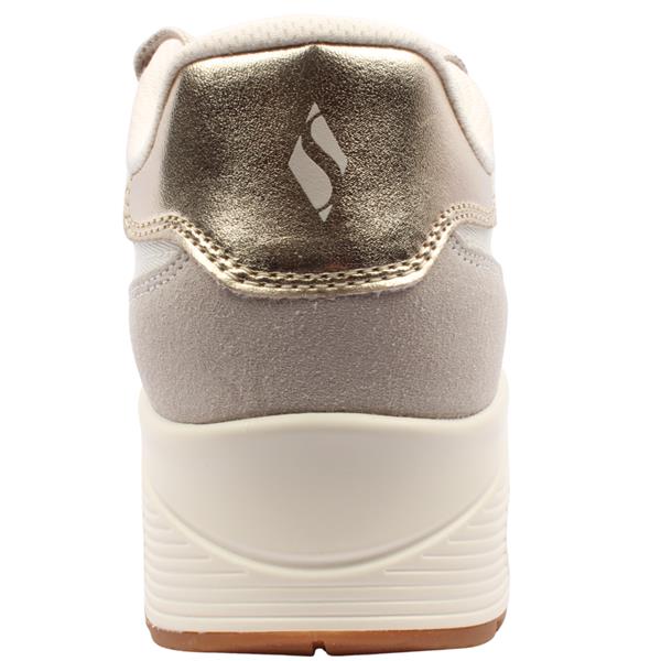 Casual ladies Skechers Shoes from Skechers Street Los Angeles collection.  This trainer features a beige/grey suede/textile upper with a metallic trim detailing on the heel. The lace closure ensures a secure and comfortable fit. The Skechers Air-Cooled Memory Foam insole and Skech-Air visible airbag midsole all add to the comfort of these shoes.