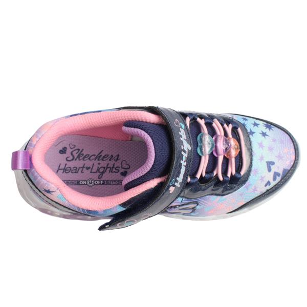 Brighten every step with the Skechers 303261L Heart Lights Runner. Designed in a fun navy multi colourway, this playful style features elastic laces with heart-shaped beads and a single Velcro strap for a secure, easy fit. The outsole is fitted with flashing Heart Lights that sparkle with every step and can be switched on or off with the convenient side button. A perfect mix of comfort, style, and fun for active little ones.