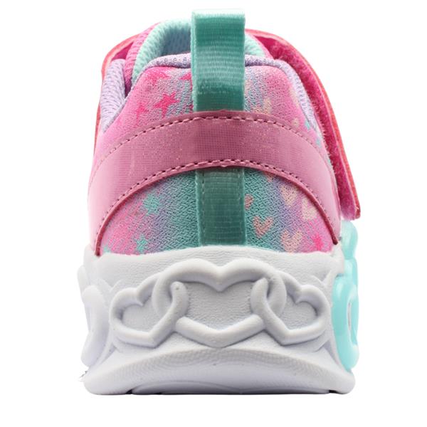 Brighten every step with these Girls Skechers light up runners. Designed in a fun pink multi colourway, this playful style features elastic laces and Velcro strap for a secure, easy fit. The outsole is fitted with flashing Heart Lights that sparkle with every step and can be switched on or off with the convenient side button. A perfect mix of comfort, style, and fun for active little ones.