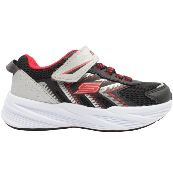 Get your little one ready for action with the boys runners from Skechers shoes. Featuring a sleek black and silver upper, these sneakers combine comfort and durability for everyday adventures. Designed for easy on and off wear they feature elasticated laces and a Velcro strap closure for a secure and adjustable fit. The sole provides lightweight cushioning and support.