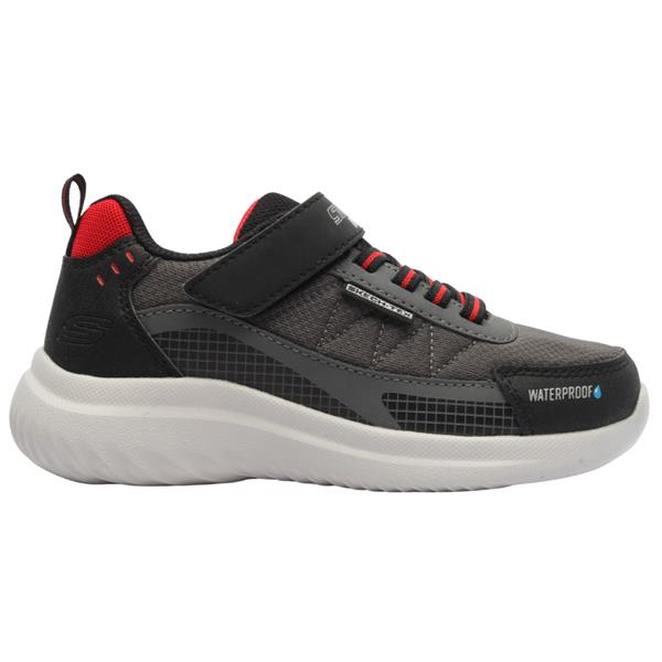 Waterproof boys runners from Skechers kids shoes range. These runners are lightweight and durable. A velcro strap closure with an elasticated lace allows for easy on/off while also keeping the shoe secure on the foot. This shoes is perfect for everyday wear thanks to its Skech-Tex waterproof lining to keep them dry on rainy days.