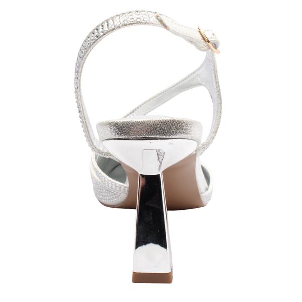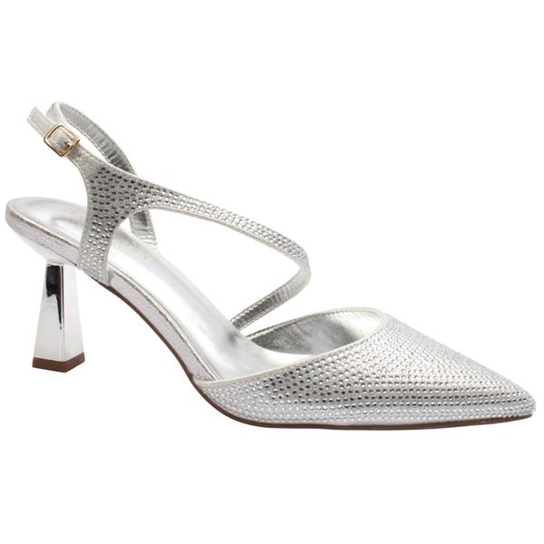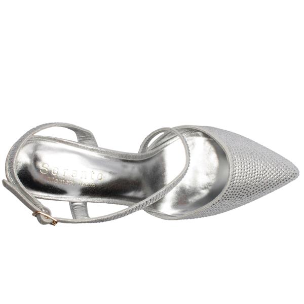 Stunning strappy high heel shoes from Sorento Shoes. Designed with a silver sparkle upper, these shoes bring a touch of glamour to any occasion. The elegant cross over strap is delicately embellished with sparkling diamantes, adding a sparkle to your look. The mid height heel provides just the right amount of lift & combined with a memory foam insole offer effortless wear from day to night. Finished with an adjustable ankle strap for a secure fit.