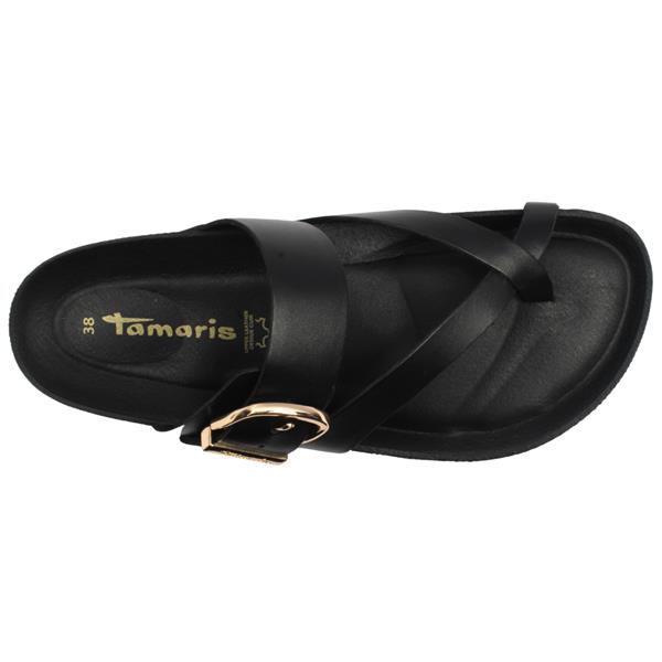 Step into summer with these Ladies Sandals from Tamaris Shoes. Crafted from premium black leather, these chic mules feature a sleek toe loop silhouette that offers a secure yet minimalist fit. The standout oversized gold buckle adds a bold, fashion-forward accent, creating the perfect contrast against the smooth black upper. Slip on styling ensures easy wear, while the cushioned footbed delivers comfort you can rely on throughout the day. Whether paired with relaxed trousers, summer dresses, or casual denim, these Tamaris mules bring understated luxury to any look.