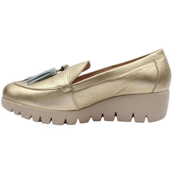Step into standout style with the Wonders Shoes C-33350. These Ladies Shoes are crafted in a gold finish and sits on a comfortable wedge sole that gives you a flattering lift without sacrificing all-day wearability. Equipped with Wonders Fly technology & a memory gel insole for all day comfort. The tassel detail at the front, combining blue accents with a touch of reptile print adds a fashion forward contrast that elevates the entire look. Easy to slip on and effortlessly stylish from Wonders Shoes.